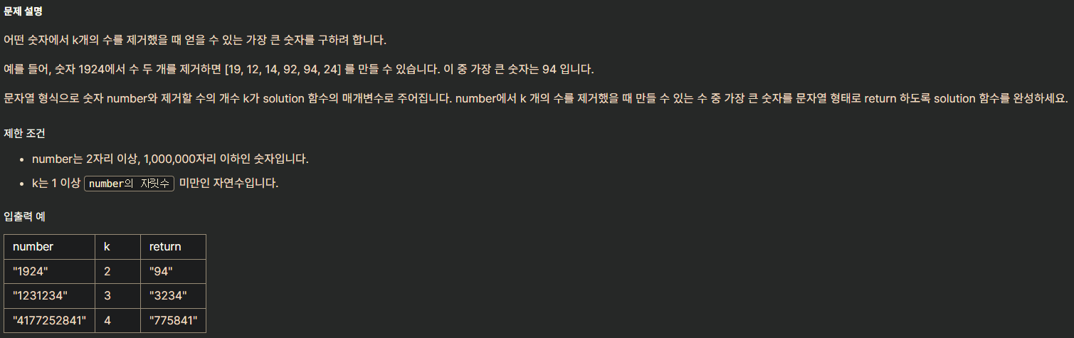 문제큰 수 만들기https://school.programmers.co.kr/learn/courses/30/lessons/42883 풀이설명주어진 숫자에서 특정 개수의 수를 제거했을 때, 남은 수들로 만들 수 있는 가장 큰 숫자를 구하는 문제입니다. 앞에서부터 숫자를 한 자리씩 비교하며, 앞자리 숫자가 뒷자리 숫자보다 작은 경우, 앞자리 숫자를 제거합니다.이 과정을 최대 k번만큼 반복하면 됩니다. 예시 코드function solution(number, k) { const stack = []; let drop = k; for (const num of number) { while (drop > 0 && stack.length && stack.at(-1) 숫자 비교 및 제거 알고리즘에 스택을 사용..