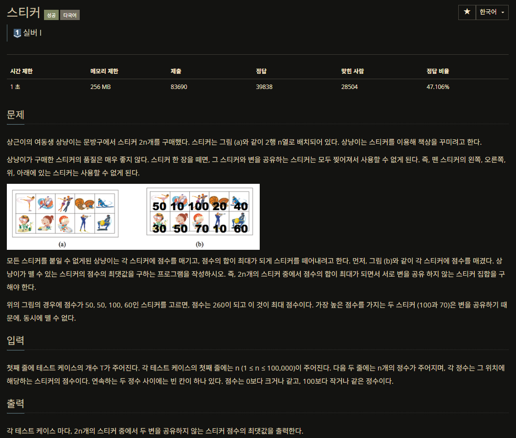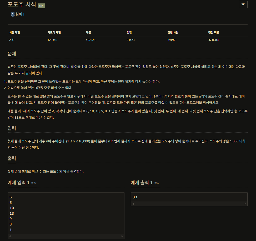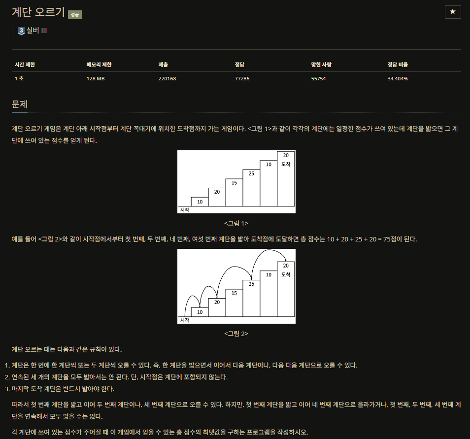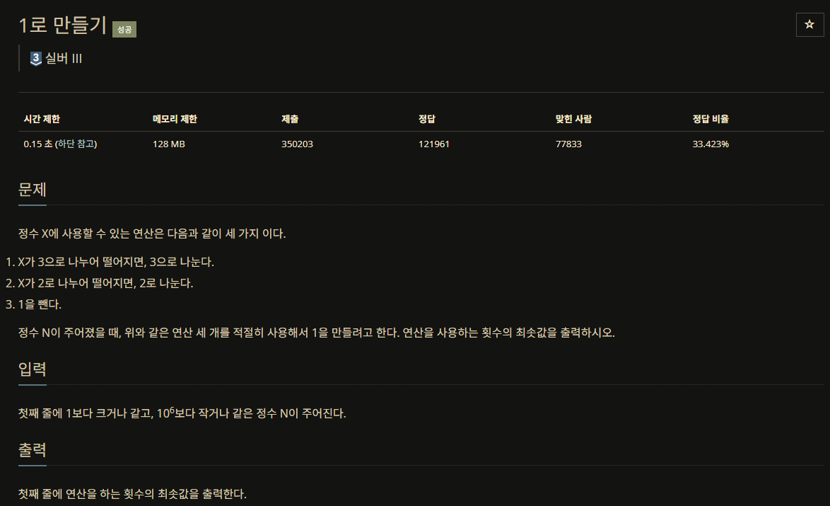 문제1로 만들기 2https://www.acmicpc.net/problem/12852 풀이설명정수 X를 1로 만들기 위해 필요한 연산의 최소 횟수를 구하는 문제입니다. 사용할 수 있는 연산은 다음과 같습니다.X가 3으로 나누어 떨어지면, 3으로 나눕니다.X가 2로 나누어 떨어지면, 2로 나눕니다.1을 뺍니다. DP를 사용해 해결할 수 있습니다. dp[i]는 i를 만드는 데 필요한 연산의 최소 횟수입니다. 점화식은 다음과 같습니다.dp[i]는 다음 세 가지 값 중 최솟값입니다.dp[i - 1] + 1i가 2로 나누어 떨어지는 경우, dp[i / 2] + 1i가 3으로 나누어 떨어지는 경우, dp[i / 3] + 1 추가적으로 경로 배열을 하나 만들어, dp 값이 업데이트 될 때마다 경로를 저장합니다.dp..