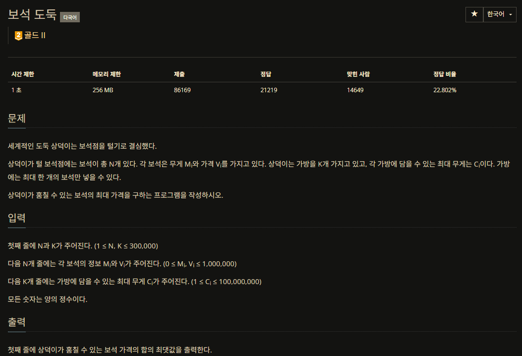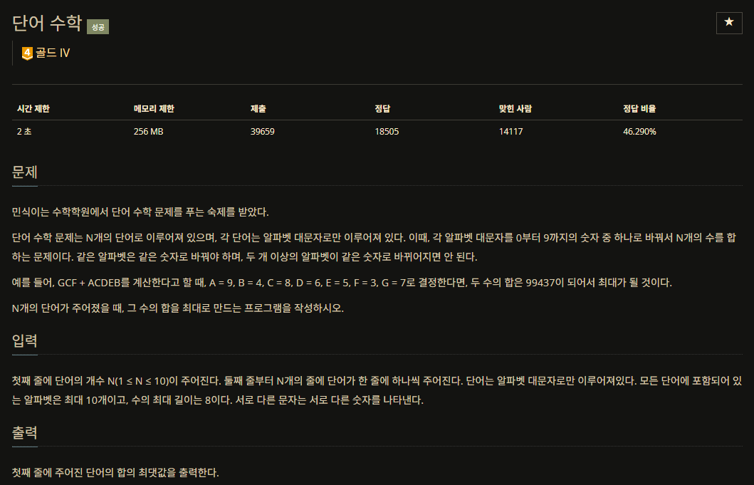 문제단어 수학https://www.acmicpc.net/problem/1339 풀이설명변환이 끝났을 때, 단어의 합의 최댓값을 구하는 문제입니다. 규칙은 다음과 같습니다.각 알파벳 대문자를 0부터 9까지의 숫자 중 하나로 바꿉니다.같은 알파벳은 같은 숫자로 바꿔야 합니다.두 개 이상의 알파벳이 같은 숫자로 바뀌어지면 안 됩니다. 방법은 다음과 같습니다.각 문자별로 자릿수 가중치를 구합니다.가장 가중치가 큰 문자부터 큰 숫자를 배정합니다. 예시 코드function solution() { const n = Number(input()); const words = Array.from({ length: n }, () => input()); const alphabetMap = new Map(); for (..