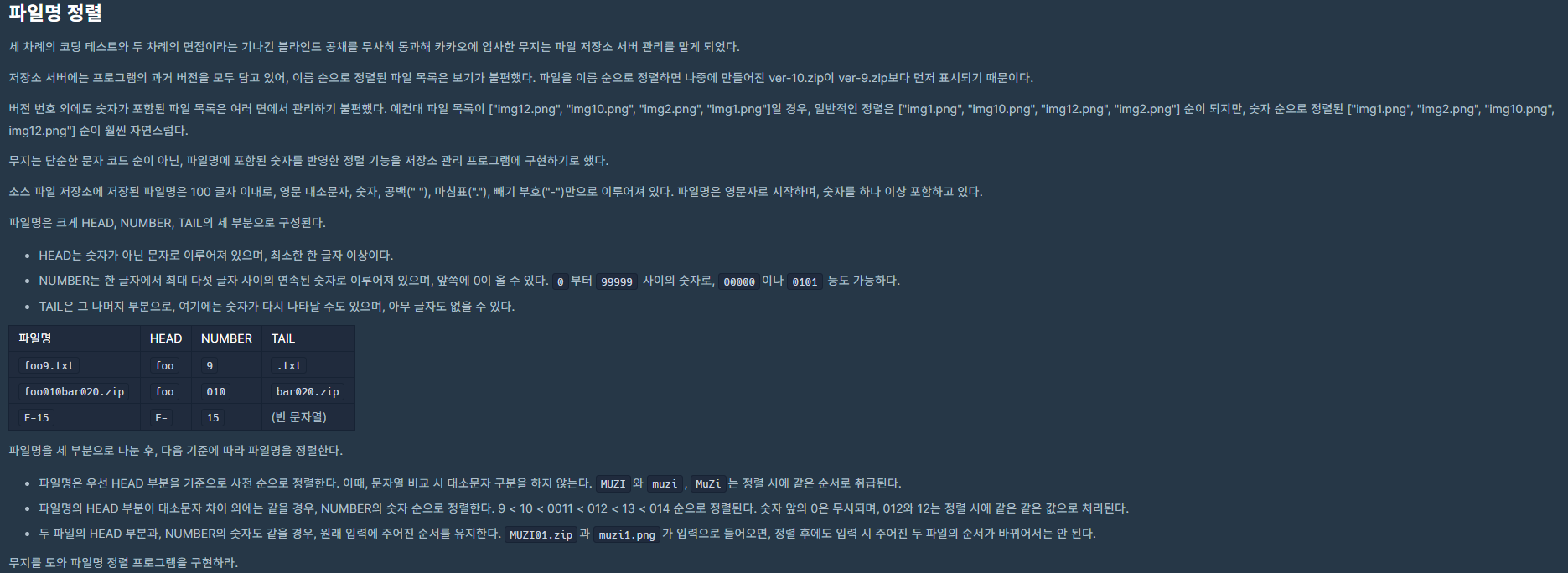 문제2018 카카오 블라인드 채용 - [3차] 파일명 정렬https://school.programmers.co.kr/learn/courses/30/lessons/17686 예시 코드function solution(filenames) { const parsedFilenames = filenames.map(parseFilename); parsedFilenames.sort((a, b) => { if (a.head b.head) return 1; return a.number - b.number; }); return parsedFilenames.map((file) => file.name);}function parseFilename(filename) { const regex = /^([^\d..