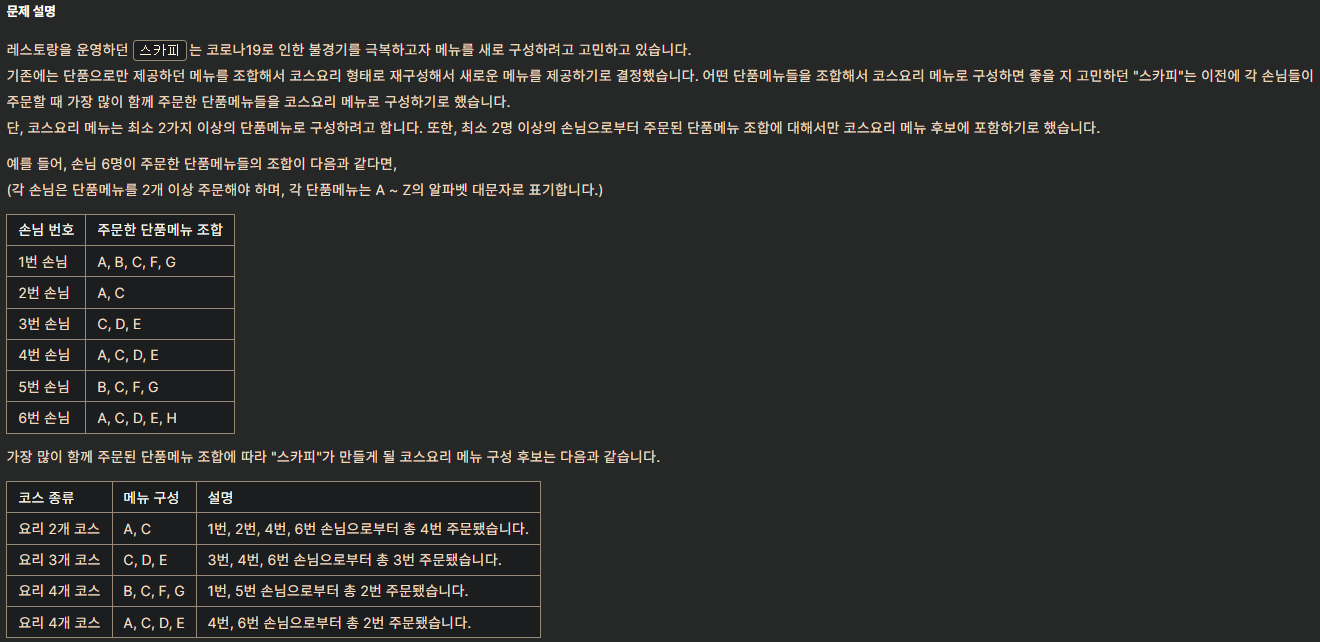 메뉴 개수 별로 최소 2번 이상 주문된 단품메뉴 조합 중 가장 많이 주문된 조합을 찾아야 합니다.